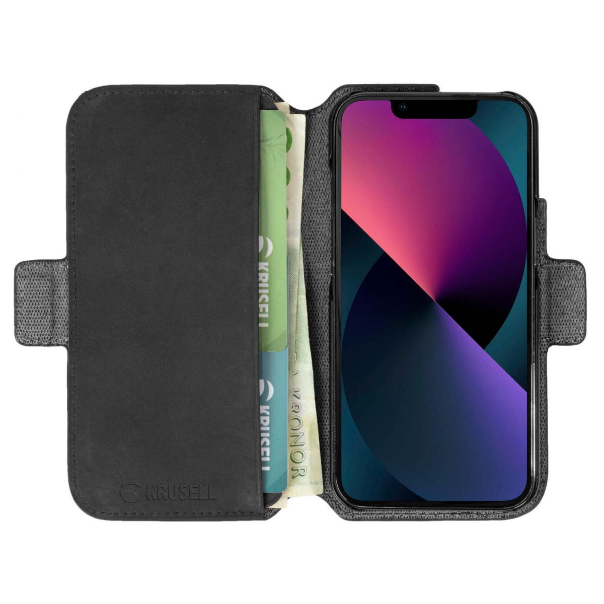 Kaitseümbris kaanega Leather PhoneWallet, Apple iPhone 13 mini, naturaalsest nahast, must, Krusell