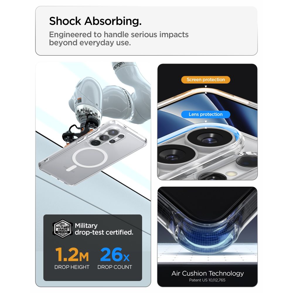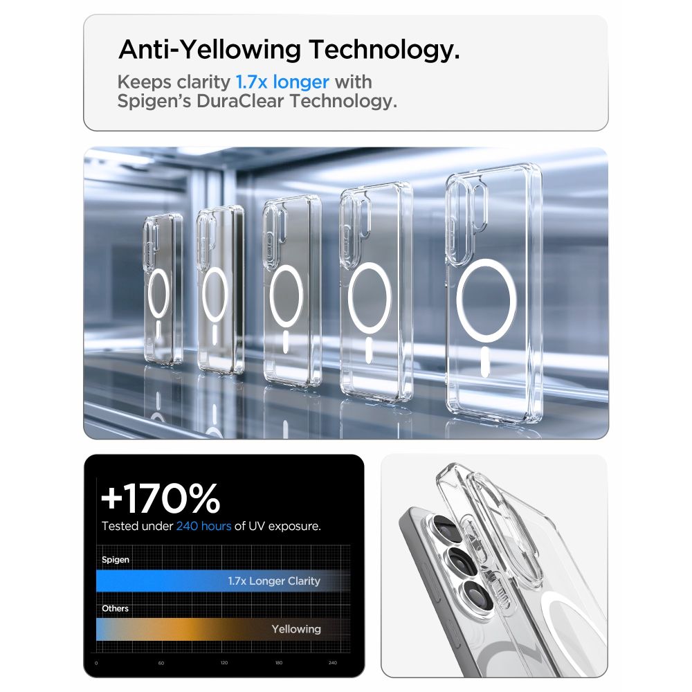 Spigen Ultra Hybrid (MagFit) kaitseümbris telefonile Samsung Galaxy S26 Ultra on täiuslik kombinatsioon läbipaistvast disainist ja täiustatud funktsionaalsusest. Integreeritud Qi2/MagSafe magnetrõngas tagab kindla ühenduse ja kiire juhtmevaba laadimise, säilitades samal ajal telefoni originaalse välimuse.