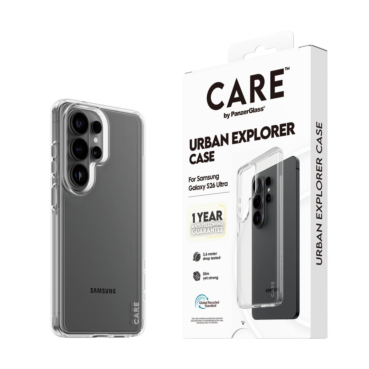 Urban Explorer seeria CARE by PanzerGlass kaitseümbris pakub Samsung Galaxy S26 Ultra telefonile tugevat kaitset kukkumiste, löökide ja kriimustuste eest ning on testitud taluma kukkumisi kuni 3,6 meetri kõrguselt. Õhuke, kuid vastupidav ümbris on loodud aktiivseks igapäevaseks kasutuseks ning säilitab telefoni algupärase välimuse. Et läbipaistev disain püsiks kauem selge, on ümbrisel ka 1-aastane garantii kollaseks muutumise vastu.